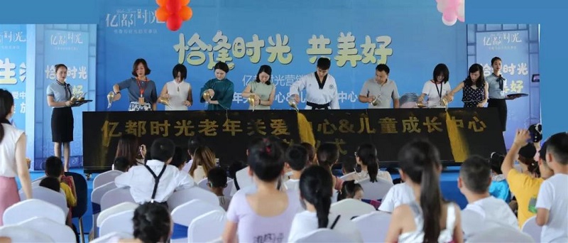 在亿都地产(控股)相关领导携手与共下,揭幕仪式完成,在众嘉宾的见证下,亿都时光营销中心暨老年关爱中心、儿童成长中心正式闪耀绽放。