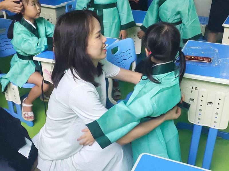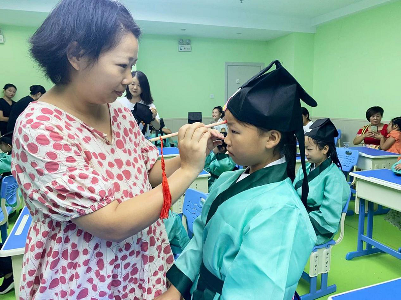 活动开始前,现场的家长们在老师的指导下,为孩子们正衣冠,表达对他们未来的期许;中国素有“衣冠上国”之称,汉服不仅是汉民族的传统服饰,更有着“知礼仪、正名分”等深刻的文化内涵。这样一个小小的环节,让孩子们明白从今天起,做一个端正的人。