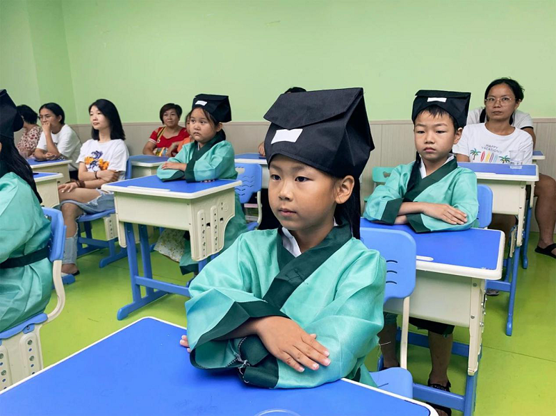 穿上了传统国学服饰的小小书生们正襟危坐,在老师的带领下诵读《弟子规》,朗朗诵读声回响在教室里。习国学文化,小小书生们跟着老师学拜师礼,尊师重教,将礼仪文化融入到日常生活中,未来做一个“谦谦君子”。