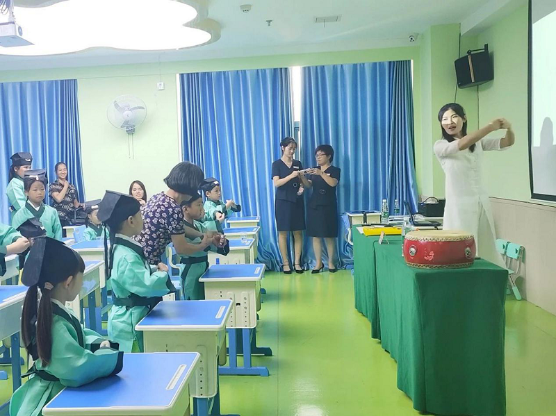 点朱砂仪式过后,全场响起了鼓舞人心的鼓声,国学老师带孩子们“击鼓明智”,“一击明德,二击亲民,三击止于至善......”孩子们一个个井然有序地击了三声鼓,敲响未来的智慧之音。